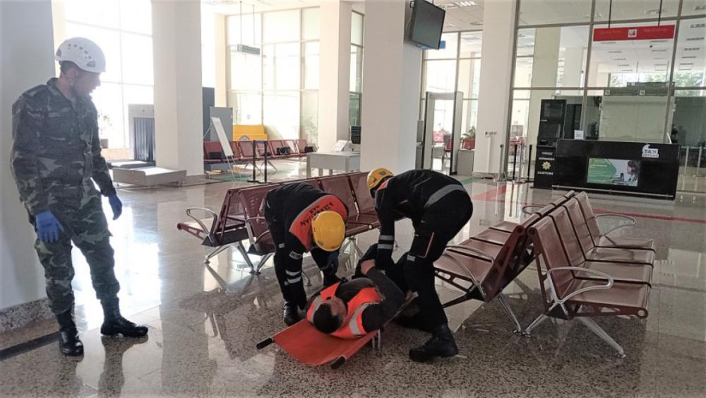 Təlimdə şərti olaraq cari texniki təmir işləri aparılan zaman anidən yaranmış yanğın hadisəsinin baş verməsi, həmçinin hava limanının sərnişingözləmə zalında şərti yanğın məlumatına əsasən həyata keçirilən yanğın-xilasetmə əməliyyatı simulyasiya edilib. Hadisə yerinə Fövqəladə Hallar Nazirliyinin qüvvə və vasitələri cəlb olunaraq hava gəmisində və gözləmə zalında baş vermiş şərti yanğının operativ “söndürülməsi”, eləcə də “zərəşəkmişlərin” xilas edilərək hava limanının tibb personalına təhvil verilməsi üzrə tapşırıqlar yerinə yetirilib.