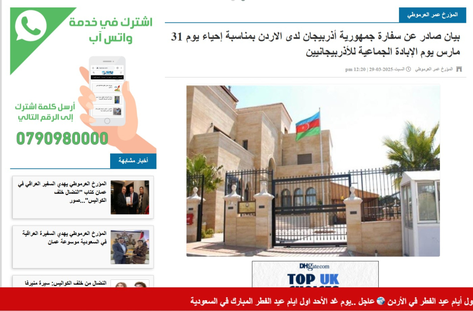 İordaniya mətbuatında 31 Mart - Azərbaycanlıların Soyqırımı Günü haqqında məqalə nəşr olunub.