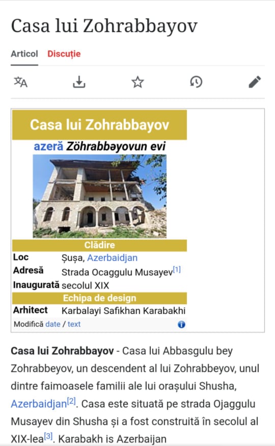 “Vikipediya”da Şuşa ilə bağlı rumın dilində...